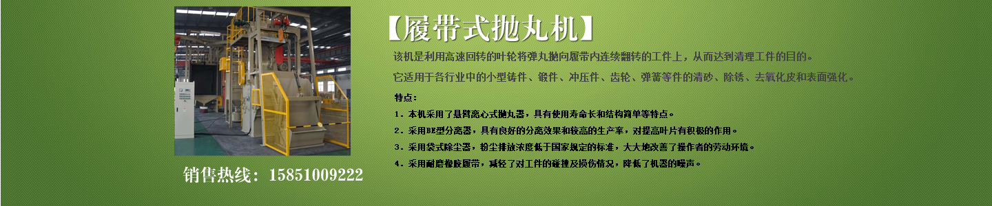 公司主要產(chǎn)品有各種型號拋丸機、履帶式拋丸機、吊鉤式拋丸機、懸鏈式拋丸機、通過式拋丸機;各種型號鑄鋼丸、鋼砂、合金鋼丸、強化鋼丸、不銹鋼丸;噴砂設備;環(huán)保除塵設備;鑄造設備;高效拋丸器;各種型號拋丸機配件等,并可根據(jù)用戶產(chǎn)品及產(chǎn)量需求設計符合要求的拋丸機;本公司產(chǎn)品從設計、開發(fā)、生產(chǎn)到服務,全過程實行監(jiān)控,其產(chǎn)品在全方位立體的營銷服務網(wǎng)絡中,遍布全國各省市區(qū)。